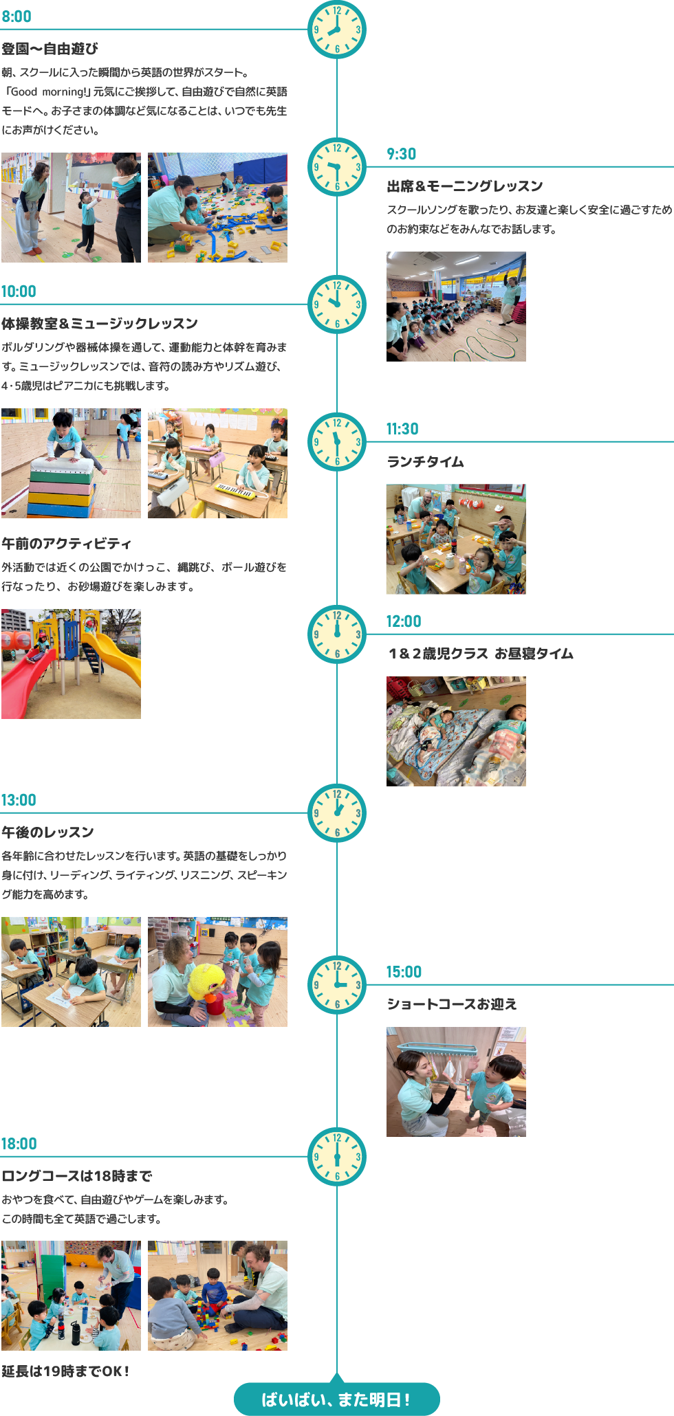 プリモニ ショート ロング アフター 登園 8 : 00 8 : 00 8 : 00 15 : 45 レッスン 9 : 30 9 : 30 9 : 30 16 : 00 お迎え 12 : 30 15 : 00 18 : 00 18 : 00 1日当り 4.5時間 7時間 10時間 2時間 ※延長保育は19時迄承っております。※土日祝祭日、お盆年末年始は休校です。※毎月29-31日は休校日です。
